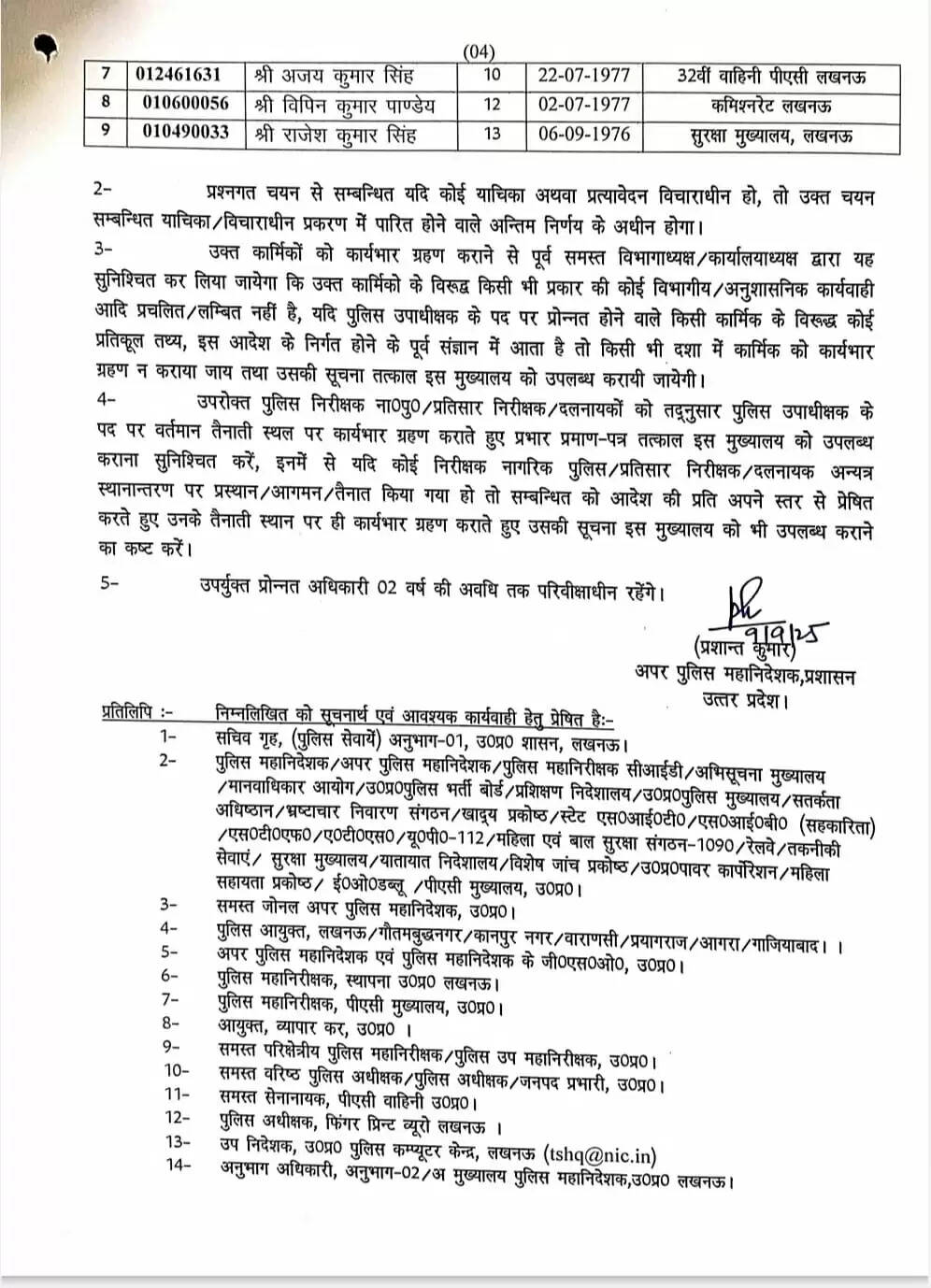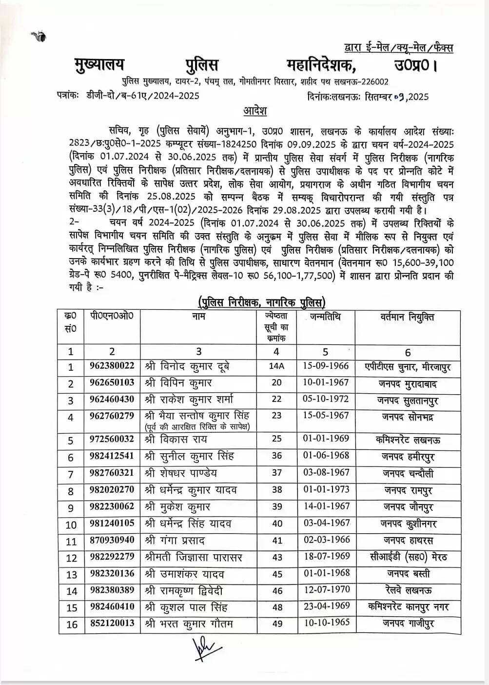 उत्तर प्रदेश पुलिस विभाग में निरीक्षकों के लिए बड़ा कदम उठाते हुए 70 पुलिस अधिकारियों को पदोन्नत किया गया है। यह पदोन्नति पुलिस निरीक्षक (नागरिक पुलिस) और पुलिस निरीक्षक (प्रतिसार निरीक्षक/दस्तावेज़) के पदों पर हुई है। इन पदोन्नतियों से पुलिस बल की दक्षता और मनोबल में वृद्धि होगी।