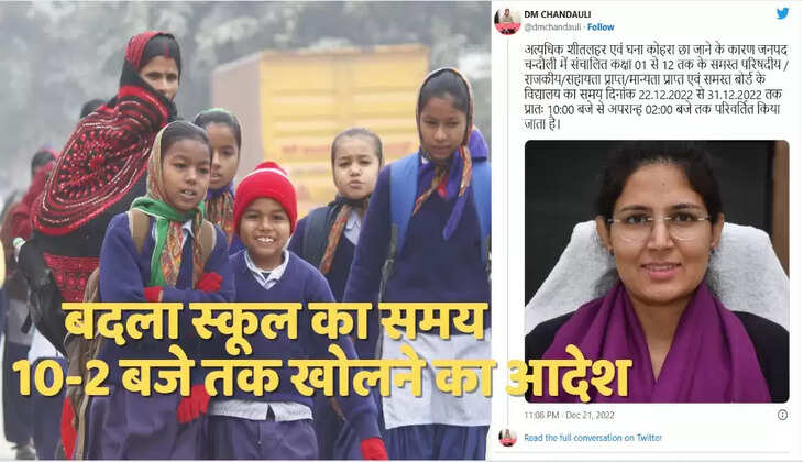 चंदौली जिले की जिला अधिकारी ईशा दुहन ने देर रात अन्य जिले के अधिकारियों के द्वारा बदले गए स्कूलों के खुलने व बंद होने के समय को देखने के बाद देर रात सोशल मीडिया के जरिए चंदौली जिले में भी स्कूलों के खुलने व बंद होने का समय बदलने की जानकारी दी। जिसमें कहा गया है कि 22 दिसंबर दिन बृहस्पतिवार से चंदौली जनपद में चल रही शीतलहर और घने कोहरे के कारण सभी कक्षा 1 से 12 तक के स्कूल व कॉलेज 10 बजे खुलेंगे और दोपहर 2 बजे बंद हो जाएंगे।