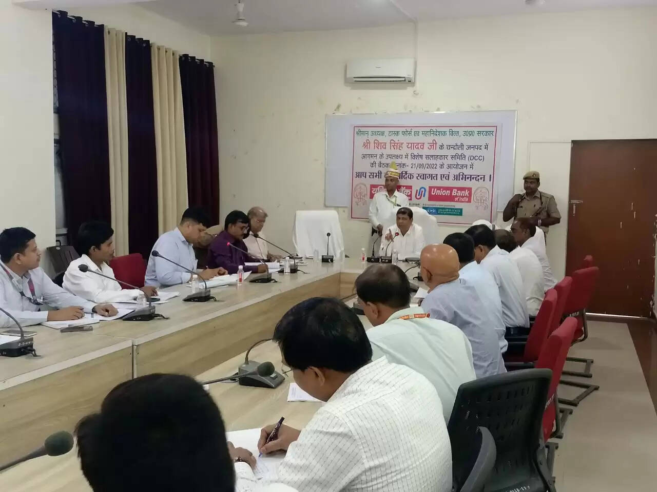 चंदौली जिले के कलेक्ट्रेट सभागार में अध्यक्ष टास्क फोर्स एवं महानिदेशक उत्तर प्रदेश सरकार शिव सिंह यादव द्वारा जनपद के अधिकारियों एवं बैंकों के प्रतिनिधियों के साथ विशेष सलाहकार समिति( डीसीसी) की बैठक संपन्न हुई, जिसमें सरकारी योजनाओं में बैंकों की दिलचस्पी कम दिखायी देने पर तमाम तरह के निर्देश दिए और नाबार्ड के अनुपस्थित अफसर के खिलाफ कार्रवाई के निर्देश दिए।