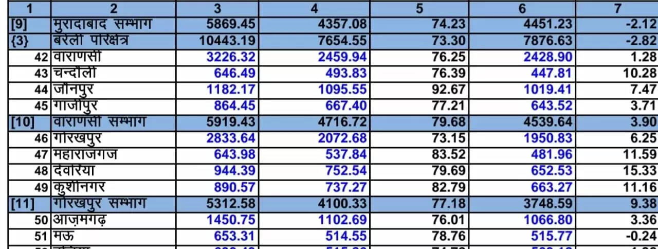 पिछले वर्ष की तुलना में चंदौली ने लक्ष्य प्राप्ति में 10.28 प्रतिशत की वृद्धि दर्ज की है। इसके विपरीत, जौनपुर ने 7.47 प्रतिशत, गाजीपुर ने 3.71 प्रतिशत और वाराणसी ने 1.28 प्रतिशत की कमी आई है।
