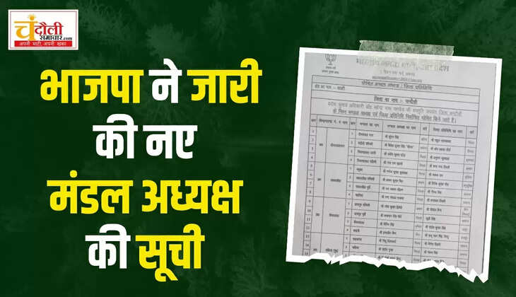 चंदौली जनपद की भारती जनता पार्टी की जिला इकाई ने चारों विधान सभाओं के 16 मंडल अध्यक्षों की सूची जारी करते हुए नए मंडल अध्यक्षों की घोषणा कर दी है। मंडल अध्यक्षों व जिला प्रतिनिधियों के नाम की अंतिम चर्चा प्रदेश भाजपा कार्यालय पर संगठन के प्रदेश के चुनाव अधिकारी डॉक्टर महेंद्र नाथ पांडे/ तथा जिला के चुनाव अधिकारियों की राय परामर्श के बाद जारी की गई है।