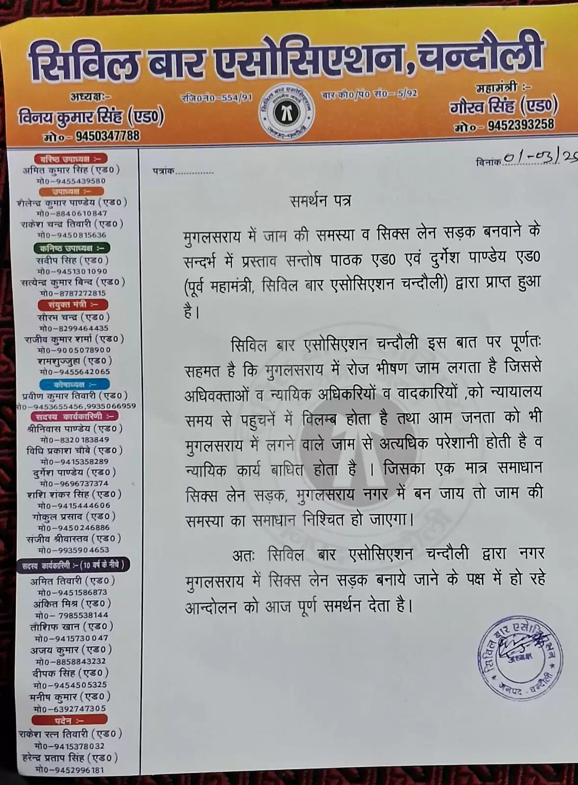 आपको बता दें कि अपने समर्थन पत्र के माध्यम से विनय कुमार सिंह ने बताया कि मुगलसराय में जाम की समस्या व सिक्स लेन बनवाने के संदर्भ में संतोष कुमार पाठक एडवोकेट एवं दुर्गेश पांडे एडवोकेट (पूर्व महामंत्री सिविल बार एसोसिएशन चंदौली) द्वारा प्रस्ताव प्राप्त हुआ था। सिविल बार एसोसिएशन चंदौली इस बात वाकिफ है कि मुगलसराय में रोज भीषण जाम लगता है इससे अधिवक्ताओं व न्यायिक अधिकारियों व वादकारियों को न्यायालय समय से पहुंचने में रोज विलंब होता है तथा आम जनता को भी मुगलसराय में लगने वाले जाम से अत्यधिक परेशानी होती है तथा रोजाना न्यायिक कार्य बाधित होता है। जिसका एकमात्र समाधान सिक्स लेन सड़क मुगलसराय में नगर में बन जाए इससे मुगलसराय नगर में जाम की समस्या का समाधान निश्चित रुप से हो जाएगा । अतः सिविल बार एसोसिएशन चंदौली द्वारा नगर मुगलसराय में सिक्स लेन सड़क बनाई जाने के पक्ष में हो रहे आंदोलन को पूर्ण समर्थन दिया जाता है।