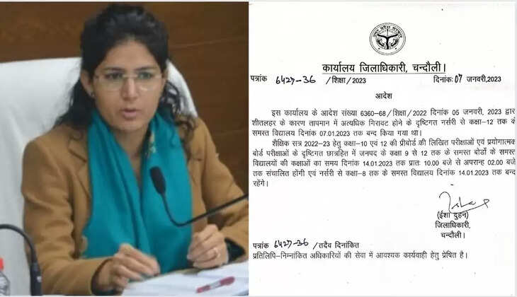 चंदौली जिले की जिला अधिकारी ईशा दुहन ने शीतलहरी और ठंड के अत्यधिक बढ़ते प्रकोप के कारण जनपद में नर्सरी से लेकर कक्षा 8 तक के समस्त स्कूल कॉलेजों को 14 जनवरी तक बंद करने का निर्देश जारी किया है। इसके साथ ही साथ शिक्षा विभाग के द्वारा आयोजित की जाने वाली प्री-बोर्ड और लिखित परीक्षाओं के साथ-साथ प्रयोगात्मक परीक्षाओं के मद्देनजर आदेश जारी किया है।