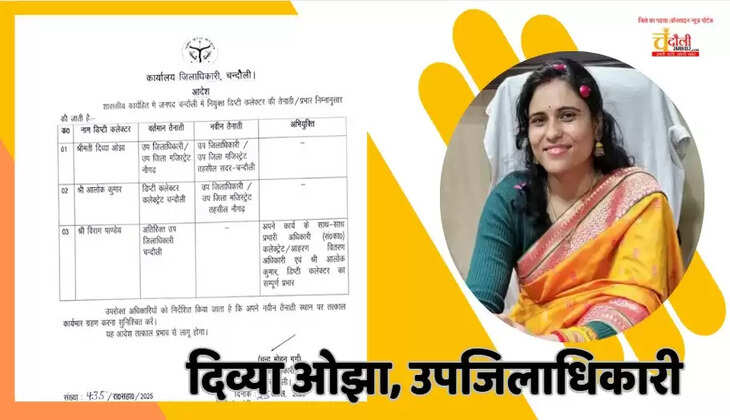 जानकारी में बताया जा रहा है कि जिलाधिकारी चंद्र मोहन गर्ग ने दिव्या ओझा को नौगढ़ से सदर तहसील का उपजिलाधिकारी बनाकर पहाड़ से मैदान में वापस बुलाया है। इसके पहले वह चकिया के उपजिलाधिकारी के रूप में काम कर चुकीं हैं। उसके पहले उनके पास खंड विकास अधिकारी चहनिया का चार्ज था। ज्वाइंट मजिस्ट्रेट हर्षिता सिंह के प्रमोशन और तबादले के बाद खाली चल रही सदर तहसील के उपजिलाधिकारी पद पर एक बार फिर एक महिला अधिकारी को तैनात किया गया है।
