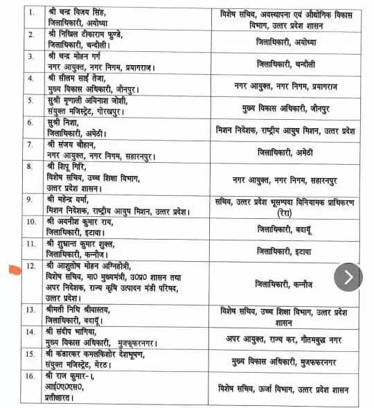 उत्तर प्रदेश सरकार ने 16 आईएएस अधिकारियों के तबादले कर दिए हैं, जिसमें कई जिलों के जिला अधिकारी और नगर आयुक्त इधर से उधर किए गए हैं। इस तबादले में कई विभागों के विशेष सचिव भी बदल गए हैं। इस तबादला सूची में चंदौली जनपद के जिलाधिकारी निखिल टीकाराम फुंडे का भी तबादला हो गया और उन्हें अयोध्या जिले का जिलाधिकारी बना दिया गया है।
