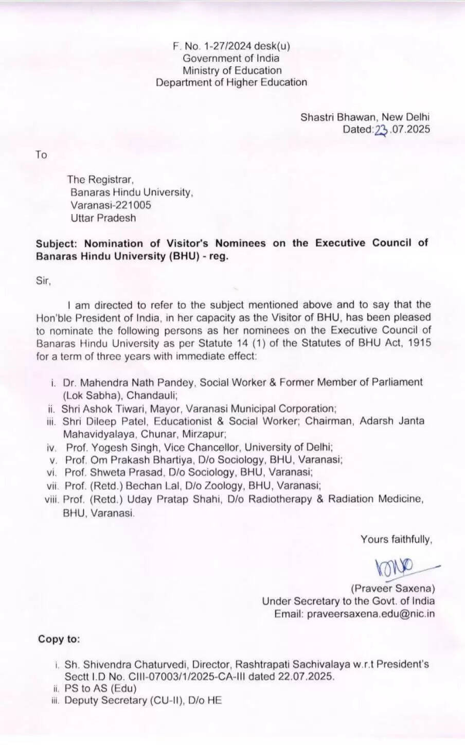 बीएचयू कार्यकारी परिषद में राष्ट्रपति ने किया नामित