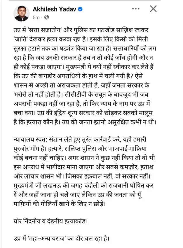 अखिलेश यादव ने अपने पोस्ट में लिखा कि उत्तर प्रदेश में 'सत्ता-सजातीय' और पुलिस का गठजोड़ साजिश रचकर 'जाति' देखकर हत्या करवा रहा है। इसके लिए किसी को मिली सुरक्षा हटाने तक का षड्यंत्र किया जा रहा है। सत्ताधारियों को लग रहा है कि जब उनकी सरकार है तब ना तो कोई जांच होगी और ना ही कोई पकड़ा जाएगा। मुख्यमंत्री यह क्यों नहीं स्वीकार कर लेते हैं कि उत्तर प्रदेश की बागडोर अपराधियों के हाथ में चली गई है? ऐसे शासन से अच्छी तो अराजकता होती है। जहां जनता सरकार के भरोसे तो नहीं होती है। सीसीटीवी के सबूत के बावजूद भी जब अपराधी पकड़ा नहीं जा रहा है तो फिर न्याय के नाम पर उत्तर प्रदेश में बचा क्या। उत्तर प्रदेश की इंद्रिय शून्य सरकार को छोड़कर सबको मालूम है कि हत्यारा कौन है। उत्तर प्रदेश की जनता इतनी असुरक्षित कभी न थी।