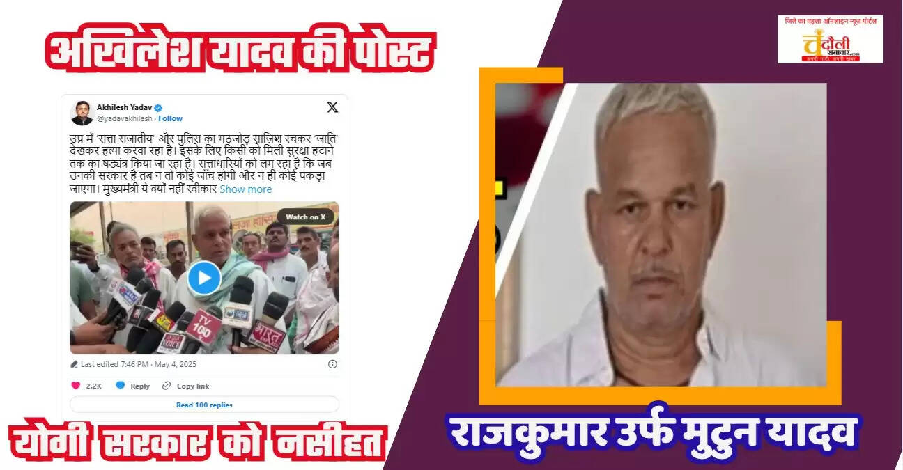 चंदौली जनपद में गैंगस्टर राजकुमार यादव उर्फ मुटुन यादव की हत्या को लेकर समाजवादी पार्टी के मुखिया और पूर्व मुख्यमंत्री अखिलेश यादव ने चंदौली पुलिस पर सवाल उठाएं हैं और सोशल मीडिया पोस्ट करके योगी सरकार को घेरने की कोशिश की है। गुरुवार को हुई हत्या के बाद पूरे जनपद में समाजवादी पार्टी के नेता पुलिस प्रशासन पर सवाल उठा रहे हैं। वहीं रविवार को अखिलेश यादव ने इस मामले में अपनी सक्रियता दिखाई और सोशल मीडिया पोस्ट में सरकार पर सवाल उठाया है।