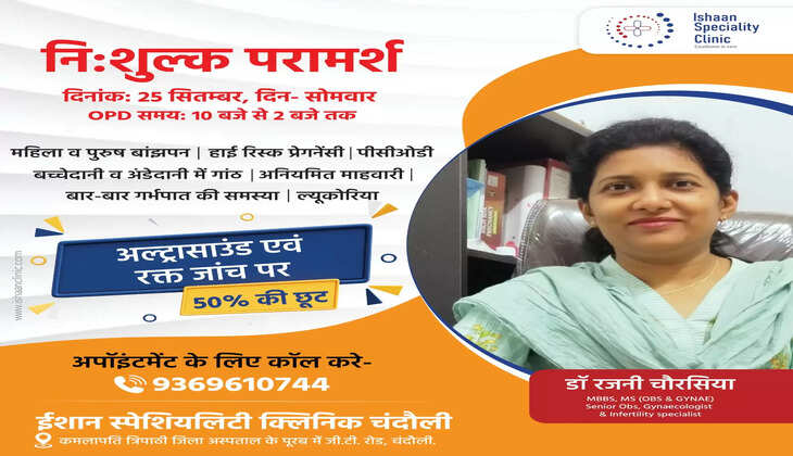 चंदौली जिले के जिला मुख्यालय पर स्थित ईशान स्पेशियलिटी क्लिनिक पर चंदौली जिले की महिलाओं व बालिकाओं के लिए सोमवार 25 सितंबर 2023 को सबेरे 10 बजे से दोपहर 2:00 बजे तक नि:शुल्क चिकित्सा परामर्श शिविर का आयोजन किया गया है। चंदौली जिला अस्पताल के पास स्थित ईशान स्पेशियलिटी क्लिनिक के जरिए यह सुविधा दी जाने वाली है।