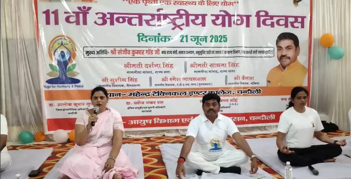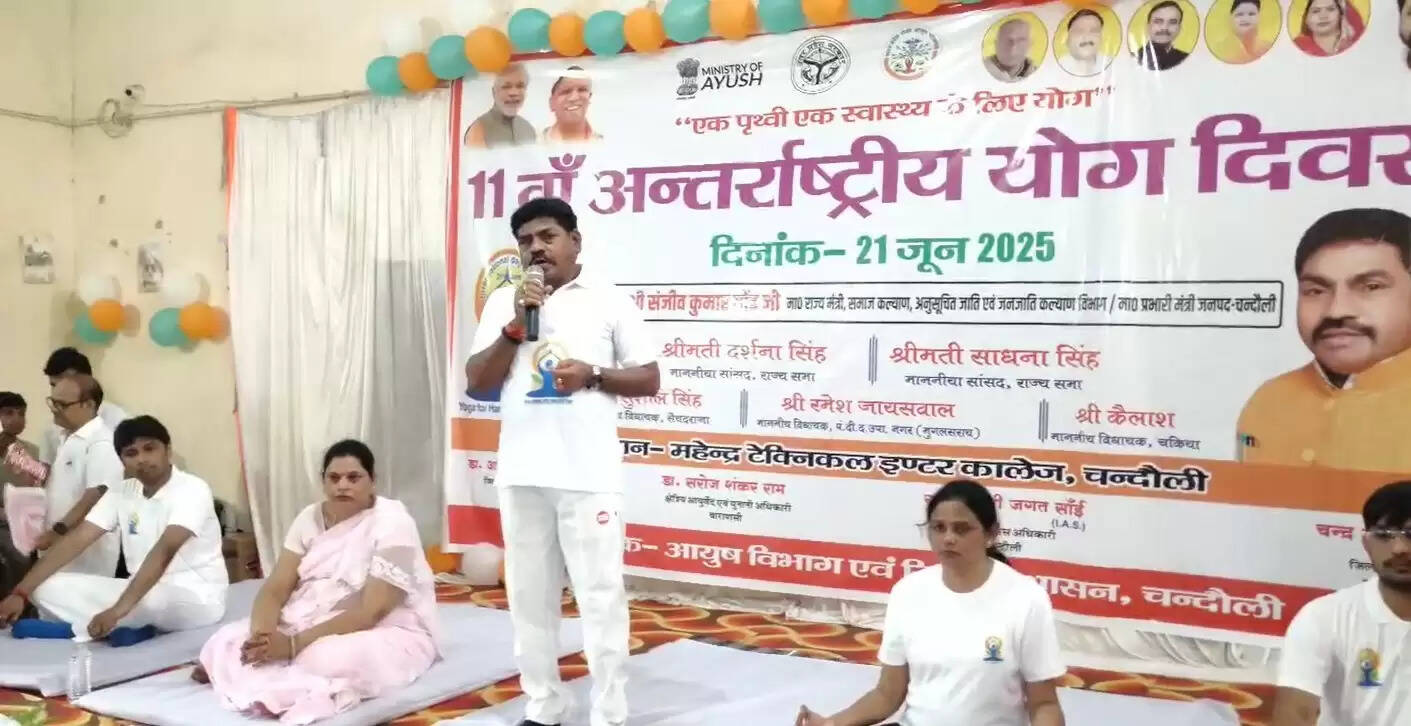 चंदौली में 11वें अंतरराष्ट्रीय योग दिवस के अवसर पर जिले में कई स्थानों पर योग कार्यक्रमों का भव्य आयोजन किया गया। जिला मुख्यालय स्थित महेंद्र टेक्निकल कॉलेज में मुख्य कार्यक्रम आयोजित हुआ, जहां उत्तर प्रदेश सरकार के राज्य मंत्री व जनपद के प्रभारी मंत्री संजीव गौड़ मुख्य अतिथि के रूप में उपस्थित रहे। उनके साथ राज्यसभा सांसद साधना सिंह, जिलाधिकारी (DM) और मुख्य विकास अधिकारी (CDO) भी मंच पर मौजूद थे।