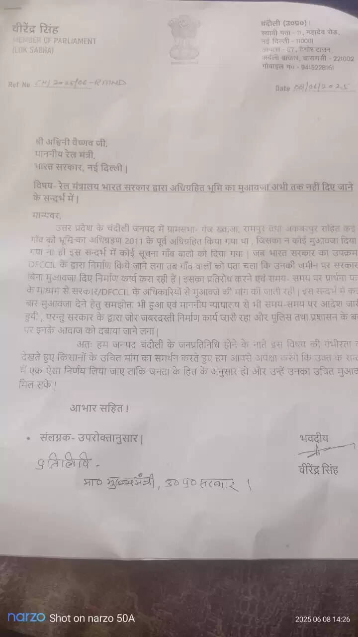 इस मामले की गंभीरता को देखते हुए सपा सांसद वीरेंद्र सिंह ने किसानों की समस्याओं को गंभीरता से सुना और उनके पक्ष में खड़े हुए। उन्होंने अपने आधिकारिक लेटरपैड पर केंद्रीय रेल मंत्री अश्विनी वैष्णव को पत्र लिखकर इस प्रकरण में त्वरित हस्तक्षेप की मांग की। उन्होंने पत्र में कहा कि किसानों की मांग पूरी तरह न्यायोचित है और सरकार को ऐसा निर्णय लेना चाहिए, जिससे प्रभावित ग्रामीणों को उनका उचित हक और मुआवजा मिल सके।