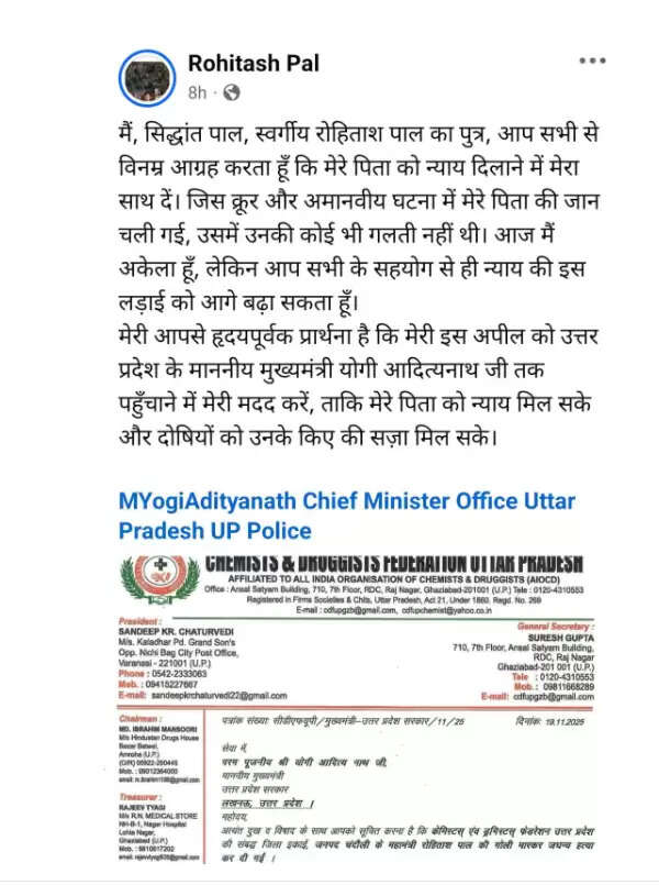 बता दें कि मृतक के पुत्र सिद्धांत पाल और छोटे भाई सिद्धार्थ पाल ने फेसबुक पर मार्मिक पोस्ट करते हुए लिखा कि यह कृत्य बेहद क्रूर और अमानवीय है, जबकि उनके पिता का किसी से कोई विवाद नहीं था। पोस्ट में उन्होंने लिखा— “जिस क्रूर और अमानवीय घटना में मेरे पिता की जान चली गई, उसमें उनका कोई दोष नहीं था। आज मैं अकेला हूं, लेकिन आप सभी के सहयोग से न्याय की इस लड़ाई को आगे बढ़ा सकता हूं। आप सभी मेरी इस अपील को मुख्यमंत्री योगी आदित्यनाथ तक पहुंचाने में मेरी मदद करें।” यह पोस्ट अब व्यावसायिक समुदाय के साथ-साथ आम जनता के बीच भी समर्थन जुटा रहा है।