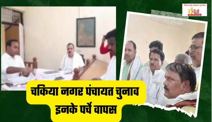 चंदौली जिला के चकिया नगर पंचायत में नगर निकाय चुनाव में नामांकन करने वाले प्रत्याशियों में नाम वापसी के दिन गुुरूवार को 5 प्रत्याशियों ने अपना पर्चा वापस ले लिया। पर्चा वापस लेने वालों में आम आदमी पार्टी के अधिकृत प्रत्याशी भी शामिल है। वही 12 वार्डों में 6 प्रत्याशियों ने अपना नामांकन पत्र वापस लिया है। पर्चा वापस लेने के बाद अध्यक्ष पद पर अब छः प्रत्याशी ही मैदान में शेष रह गये हैं। जिससे अबकी बार चुनाव में दिलचस्प मुकाबला देखने को मिल सकता है।