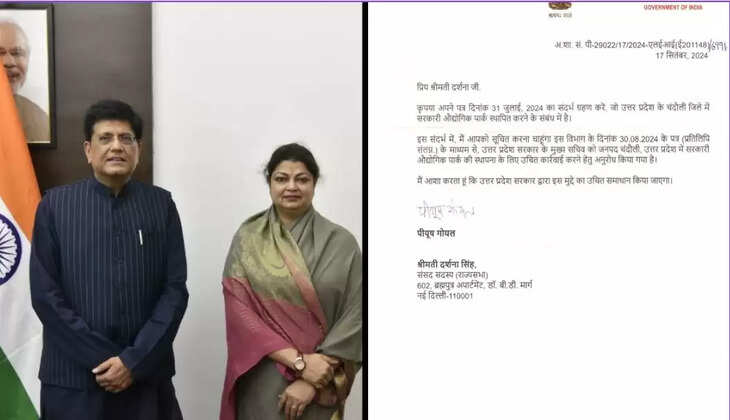 इस पर उद्योग मंत्री पीयूष गोयल ने राज्यसभा सांसद दर्शना सिंह को आश्वस्त किया था कि सरकार उनकी मांग पर बेहद संवेदनशीलता से विचार करेगी और इस संबंध में सकारात्मक निर्णय जल्द लिया जाएगा। इसी के तहत वाणिज्य और उद्योग मंत्रालय से दर्शना सिंह को पत्र के माध्यम से अवगत कराया गया है कि वाणिज्य और उद्योग मंत्री पीयूष गोयल जी के निर्देशानुसार उत्तर प्रदेश सरकार को जनपद चंदौली में सरकारी औद्योगिक पार्क कि स्थापना के लिए उचित कार्यवाही किये जाने हेतु निर्देशित किया गया है।