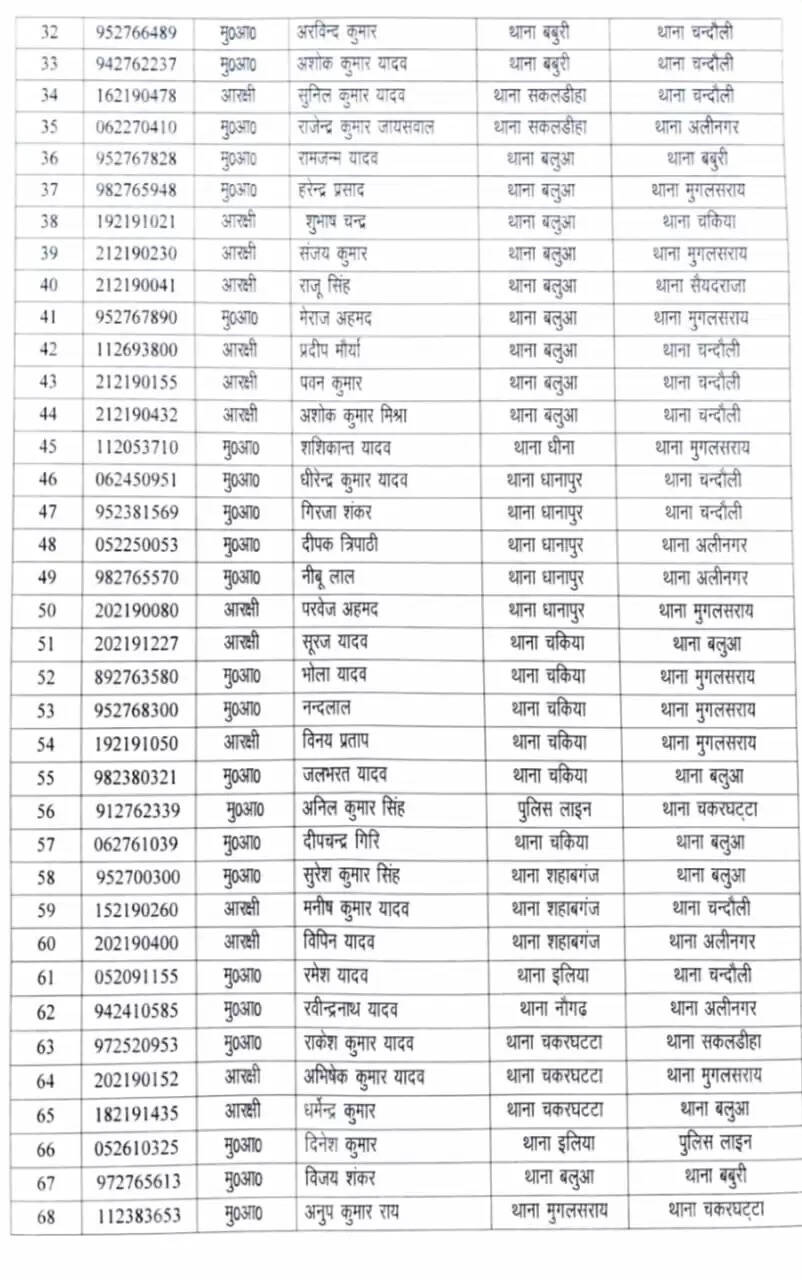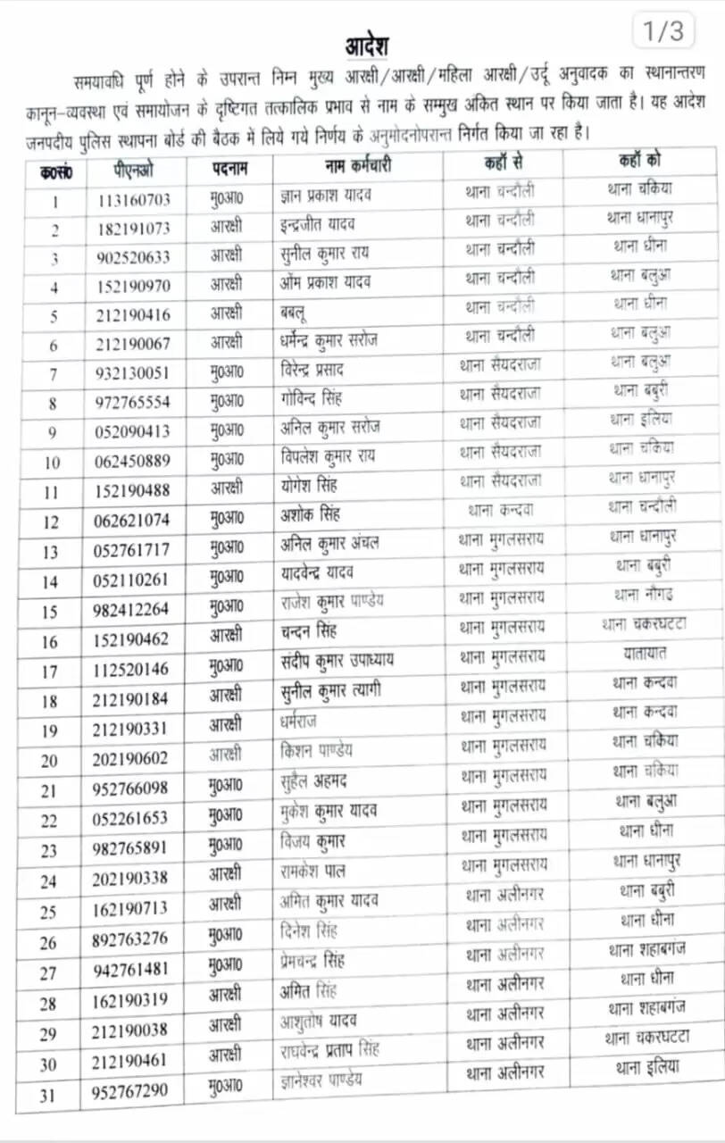 उप निरीक्षक संतोष त्रिपाठी चंदौली कोतवाली से रामपुर भभौरा पुलिस चौकी के नए प्रभारी बनाए गए हैं, जबकि कृष्ण कुमार उपाध्याय को भदाहूँ कांधरपुर पुलिस चौकी से हटकर नौगढ़ थाना क्षेत्र की हरिया बांध पुलिस चौकी भेज दिया गया है। सूरज सिंह चौकी प्रभारी इलिया कस्बा से हटकर चौकी प्रभारी भादाहूँ काँधरपुर बनाए गए हैं। वहीं उप निरीक्षक राम भवन यादव को हरिया बांध पुलिस चौकी से हटकर इलिया पुलिस चौकी में तैनात कर दिया गया है। उप निरीक्षक सुरेश प्रकाश सिंह को चौकी प्रभारी मझगावा से हटकर चौकी प्रभारी महुजी बनाया गया है, जबकि दुल्हीपुर पुलिस चौकी के प्रभारी मोहम्मद अरशद को मुगलसराय कोतवाली से संबंध कर दिया गया है। ताराजीवनपुर पुलिस चौकी के प्रभारी वरुणेंद्र कुमार राय को वरिष्ठ उप निरीक्षक सकलडीहा बना दिया गया है जबकि सकलडीहा के वरिष्ठ उप निरीक्षक त्रिवेणी प्रसाद तिवारी को वरिष्ठ उप निरीक्षक कंदवा के रूप में तैनात किया गया है।