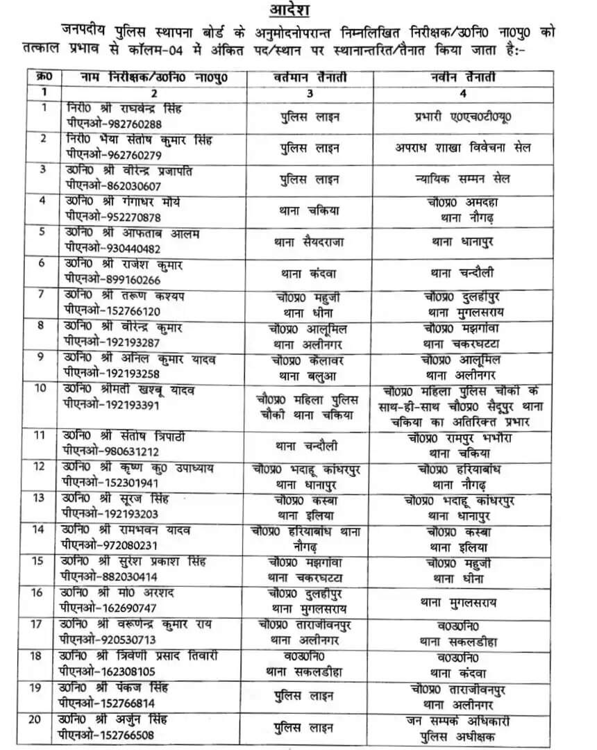 पुलिस अधीक्षक कार्यालय से मिली जानकारी में बताया जा रहा है कि चंदौली जिले के पुलिस अधीक्षक आदित्य लांग्हे ने तबादला सूची जारी करते हुए दो इंस्पेक्टर तथा 18 सब इंस्पेक्टर को इधर से उधर किया है और नई जगह पर तैनात कर दिया है। उसके अलावा 93 पुलिस के सिपाहियों को भी नई जगह पर तैनाती दी है और एक थाने पर लंबे समय से तैनात लोगों को हटाया गया है।