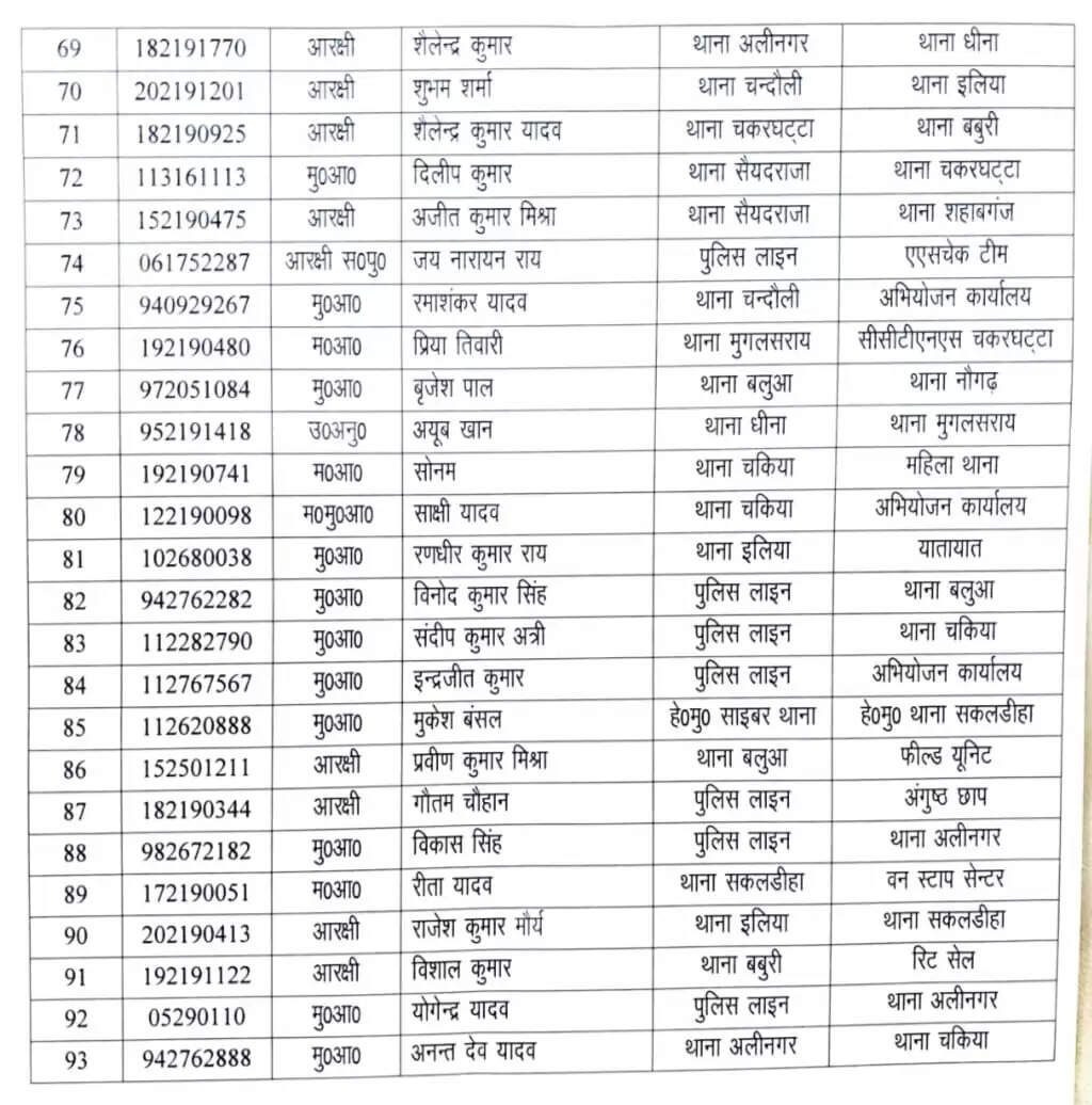 इसके अलावा पुलिस अधीक्षक में चंदौली जनपद के विभिन्न स्थानों और पुलिस लाइन में तैनात 93 पुलिस कर्मियों को भी एक जगह से दूसरे जगह भेज दिया है। पूरी तबादला सूची देखने के लिए आप यहां क्लिक कर सकते हैं...