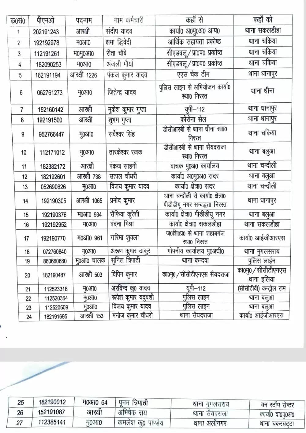 चंदौली जनपद के पुलिस अधीक्षक आदित्य लांग्हे ने एक बार फिर कई पुलिस कांस्टेबल और हेड कांस्टेबल्स का तबादला किया है। लंबे समय से एक जगह पर तैनात इन पुलिस कर्मियों का तबादला करने के बाद तत्काल प्रभाव से नए तैनाती स्थल पर ज्वाइन करने का आदेश दिया है।