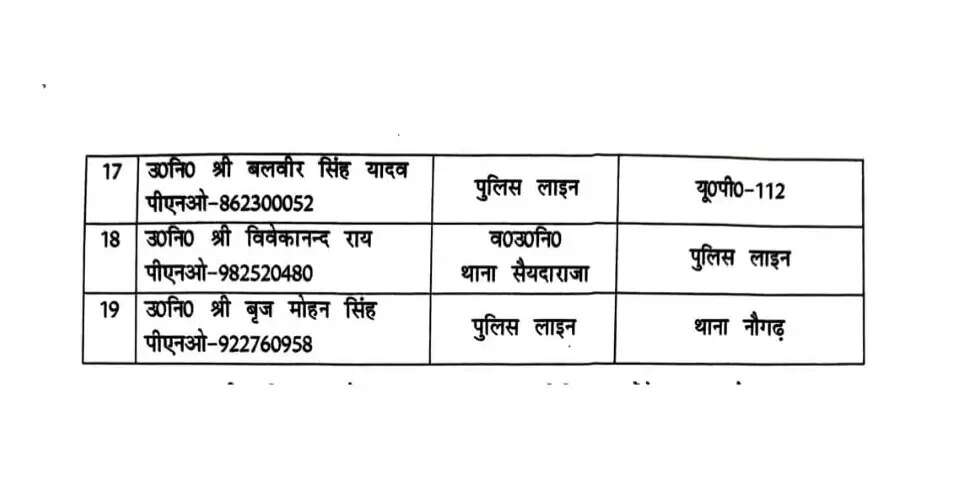 इसके अलावा यूपी 112 में तैनात उप निरीक्षक देवेंद्र कुमार राय को धानापुर थाने पर और उप निरीक्षक मारकंडेय सिंह को पुलिस लाइन से सैयदराजा थाने पर भेजा गया है, जबकि उप निरीक्षक मुन्ना सिंह को पुलिस लाइन से बलुआ थाने पर तैनाती दी गई है। वहीं सैयदराजा थाने में वरिष्ठ उप निरीक्षक पद पर तैनात विवेकानंद राय को थाने से हटाकर पुलिस लाइन में आमद करने के लिए कहा गया है। उप निरीक्षक बलवीर सिंह यादव को पुलिस लाइन से यूपी 112 में भेजा गया है, जबकि उप निरीक्षक ब्रजमोहन सिंह पुलिस लाइन से नौगढ़ थाने पर तैनात किए गए हैं।