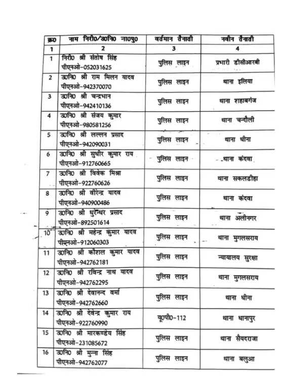इसके साथ ही साथ वीरेंद्र यादव को पुलिस लाइन से कंदवा थाने पर, उप निरीक्षक धुरंधर प्रसाद को अलीनगर थाने पर, उप निरीक्षक महेंद्र कुमार यादव को मुगलसराय कोतवाली, उप निरीक्षक कौशल कुमार यादव को न्यायालय सुरक्षा, उप निरीक्षक रविंद्र नाथ यादव को मुगलसराय कोतवाली और देवानंद वर्मा को धीना थाने में भेजा गया है।