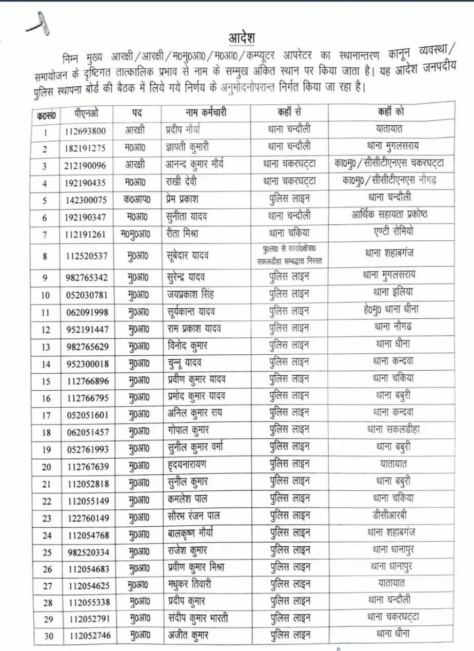 चंदौली समाचार पर देखिए पूरी तबादला सूची