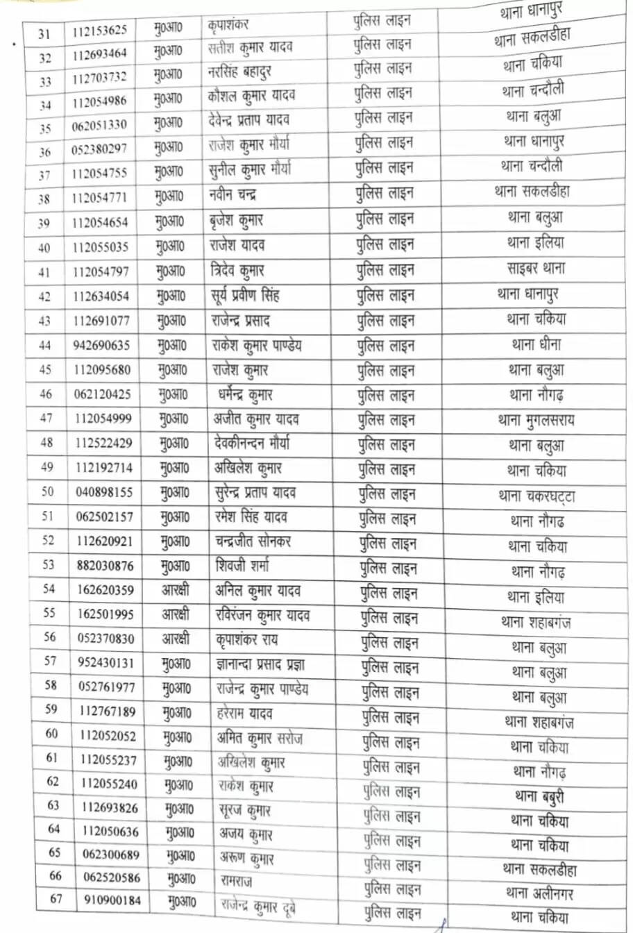 चंदौली जिले के पुलिस अधीक्षक आदित्य लांग्हे ने सोमवार की सुबह उप निरीक्षकों और इंस्पेक्टर के तबादले के बाद देर रात कांस्टेबल और हेड कांस्टेबल की तबदला सूची जारी कर दी। इसमें कुल 73 पुलिस कांस्टेबल के नाम हैं, जिसमें मुख्य आरक्षी, आरक्षी, महिला मुख्य आरक्षी, महिला आरक्षी, कंप्यूटर ऑपरेटर समेत तमाम पुलिसकर्मी शामिल हैं।
