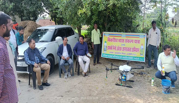आयोजित कार्यक्रम के दौरान जनपद में कुल 06 एलईडी वैन के माध्यम से प्रतिदिन ग्राम पंचायतों में केंद्र सरकार द्वारा संचालित जनकल्याणकारी योजनाओं के संबंध में जन मानस को जानकारी दी जा रही है, जिससे कि समाज के वंचित लोगों को केंद्र सरकार द्वारा संचालित योजनाओं की जानकारी प्राप्त हो सके और वह इस योजना से जुड़कर लाभान्वित हो। साथ ही मौके पर विकसित भारत संकल्प यात्रा के अंतर्गत ग्राम पंचायत खगवल मे ड्रोन से नैनो यूरिया के छिड़काव का प्रदर्शन/सफल छिड़काव किया गया।