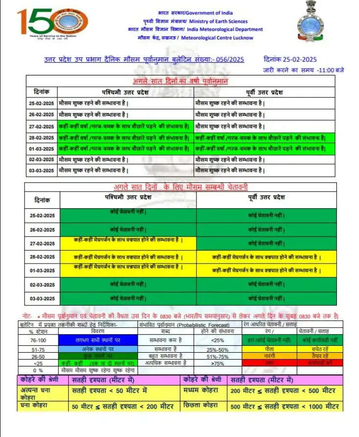 मौसम विभाग का दावा है कि 28 फरवरी और 1 मार्च को पूर्वी उत्तर प्रदेश के कई जिलों में गरज व चमक के साथ हल्की और मध्यम बारिश होने के आसार हैं। इससे तापमान में गिरावट आ सकती है और ठंडक भी बढ़ सकती है। प्रदेश के पश्चिमी हिस्सों में कोहरा छाए रहने की संभावना जताई जा रही है।