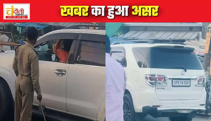 चंदौली समाचार के खबर का हुआ असर, बाबा की गाड़ी का यातायात पुलिस ने किया चालान